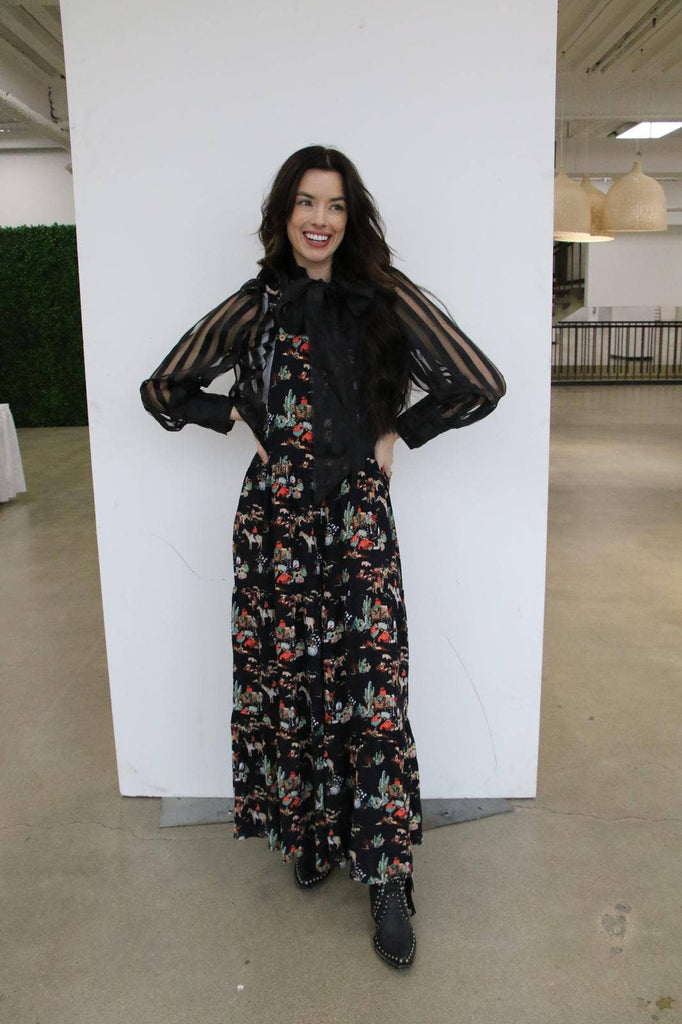 OPEN SIZING Product Description: This tiered maxi dress offers a perfect blend of comfort and style with a casual yet feminine silhouette. * Material: Lightweight woven fabric with a soft finish. * Pattern: All-over earthy cactus and floral print, ideal for nature-inspired or boho collections. * Design Details: * Square neckline with wide shoulder straps, secured with button accents. * Tiered skirt construction for added volume and movement. * Relaxed fit for all-day wear. * Length: Full-length maxi dress, ideal for versatile styling. * Closure: Pullover style (no visible zippers or fastenings). Perfect for boutiques looking for bohemian or desert-themed fashion items for casual and resort wear collections.